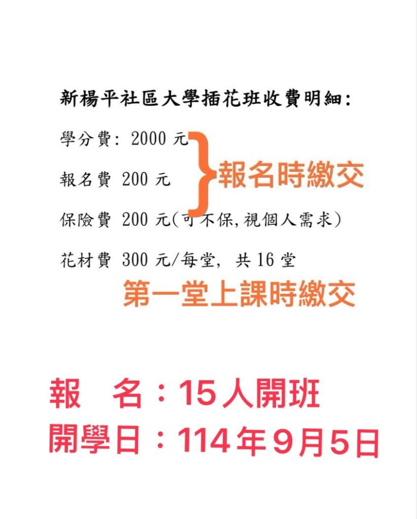 新楊平社區大學藝術插花 分類:Xinying2025 年 7 月 28 日發表於資訊分享,市民活動中心課程,新英才藝班 ☘️邀請您 一起加入插花 、 爱花行列☘️讓生活更多多姿 🕖上課時間 : 每週五 晚上19:00-21:00🏢上課地點 : 新英市民活動 中心(平鎮區新富五街 66 號3樓)報名地點 :平鎮區和平路 190 號3樓📞報名電話 :03-4587750(社大平鎮辦公室)0932-315979( 新英里 秦里長) 指導老師 :王 淑 蘭 老師0939 – 998870 喜歡 正在載入... 相關